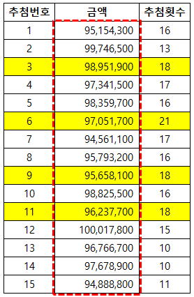 추첨번호가 3, 6, 9, 11이라도 번호와 복수예가의 매칭에 따라 예정가격은 완전히 달라집니다.