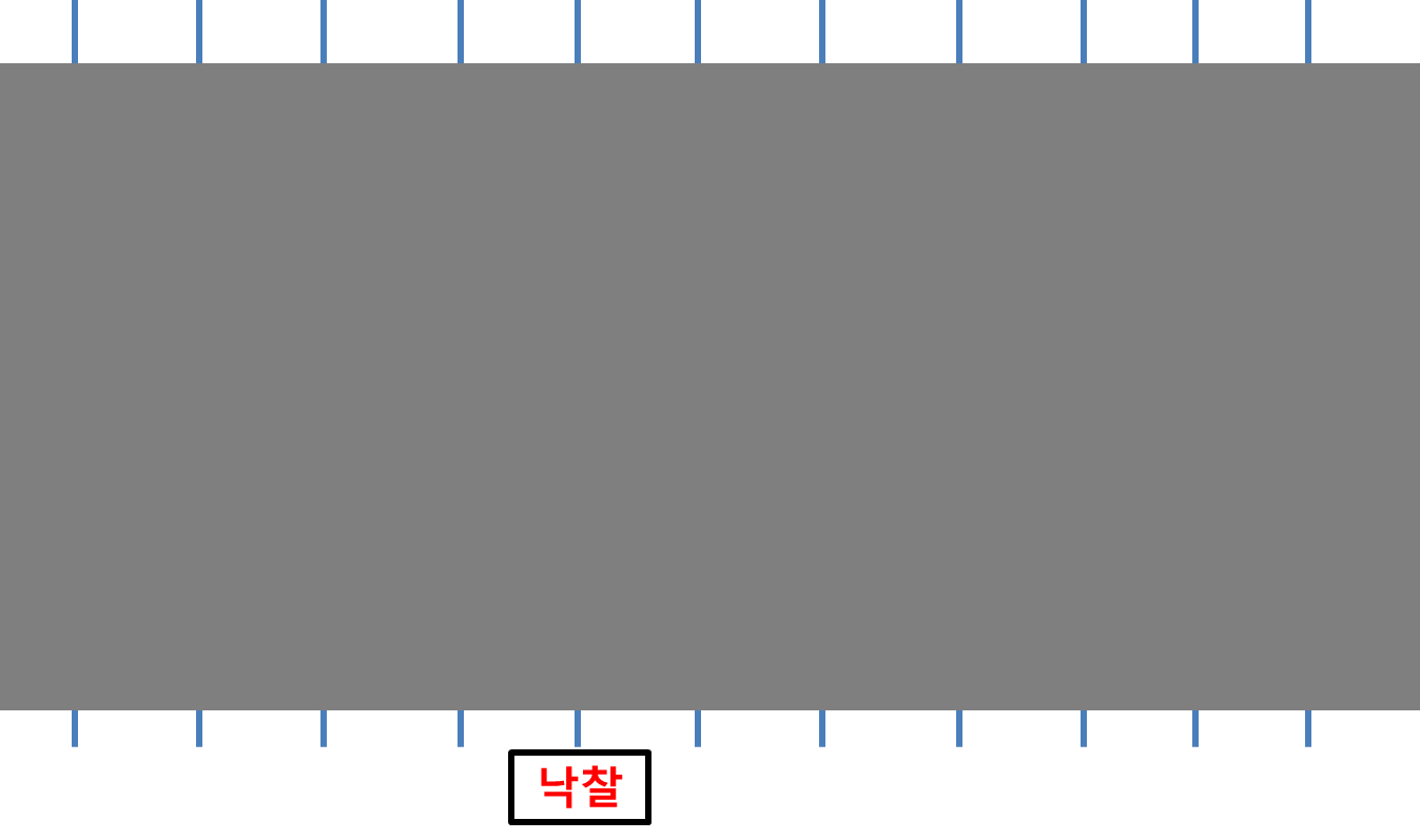 아래의 그림은 입찰을 사다리게임으로 패러디한 것입니다. 위에서 하나의 선을 선택하는데, 그 중 어떤 선 하나는 낙찰과 연결이 되어 있고 나머지는 전부 꽝입니다. 회색구역 안의 가로로 연결되는 선들은 무작위로 그어져 있으며 어떻게 연결되어 있는지 알 수가 없습니다.