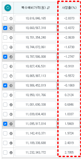 입찰정보싸이트에서 번호를 선택할 때는 반드시 복수예비가격을 올림차순으로 정렬을 한 후 선택해야 합니다.