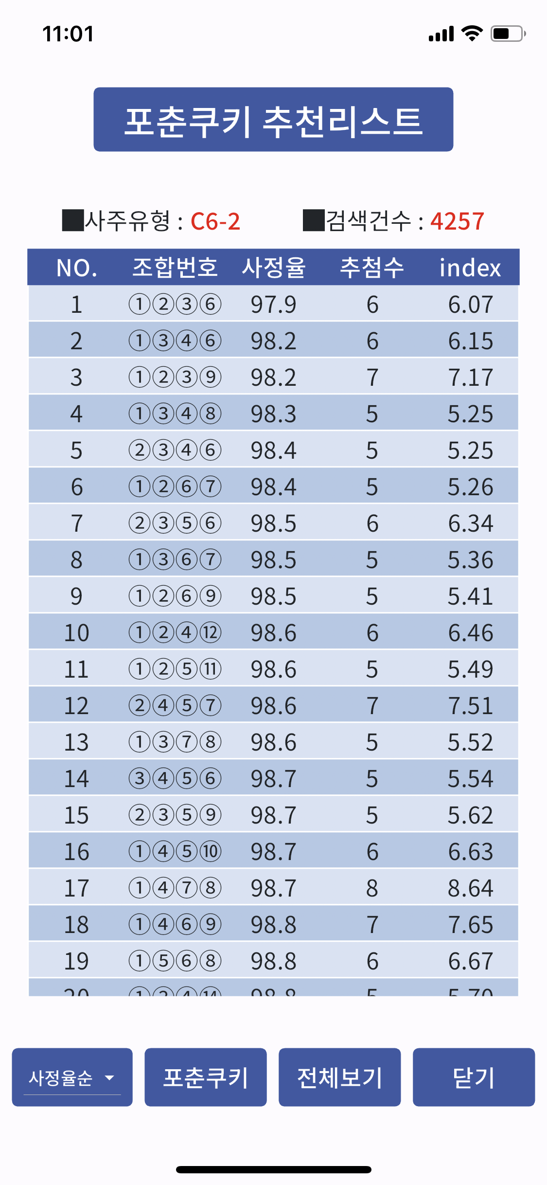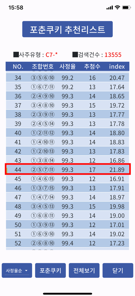 때문에 인덱스순으로 선택하려고 하면 보통은 index값이 가장 높은 조합번호를 선택하려고 할 것입니다.